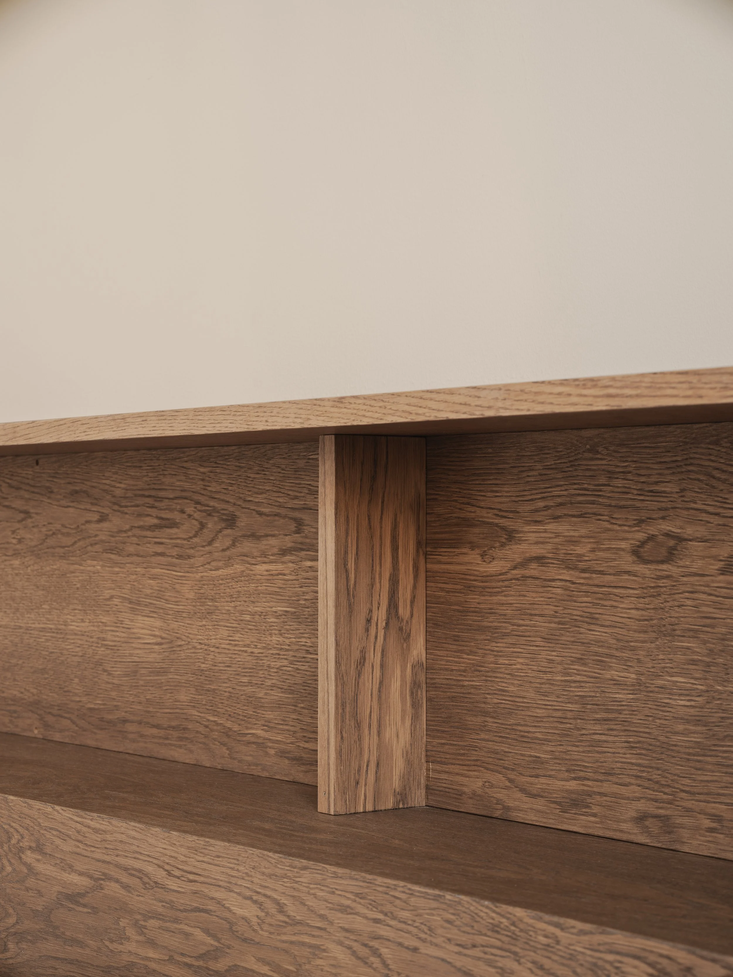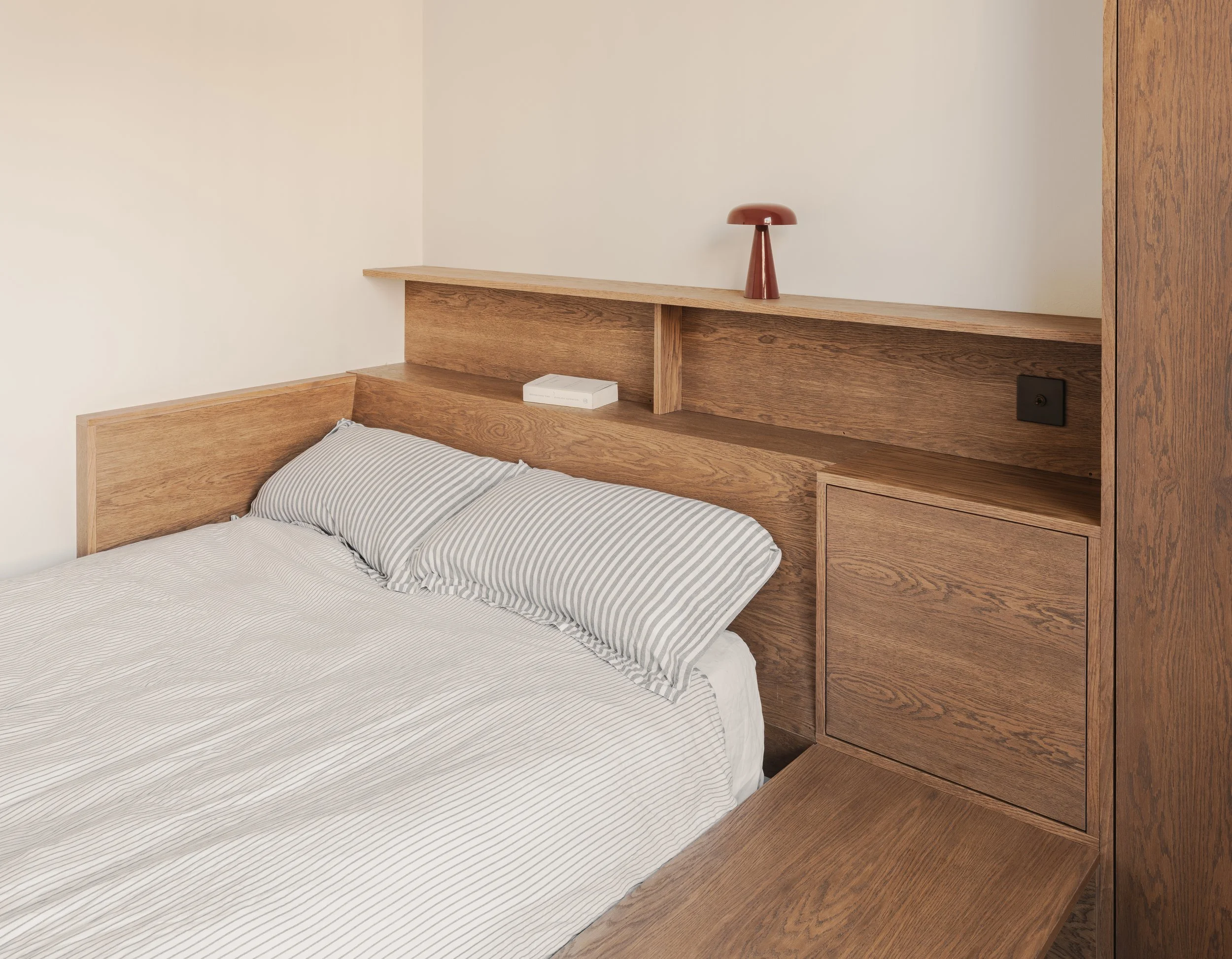 In the bedroom, custom oak-veneered furniture provides a sense of warmth and cohesion. The built-in headboard and thoughtfully designed storage blend seamlessly into the space, enhancing comfort while maintaining a minimalist, considered approach. The result is a home that feels both effortless and intentionally crafted—tailored to the client's needs and lifestyle.