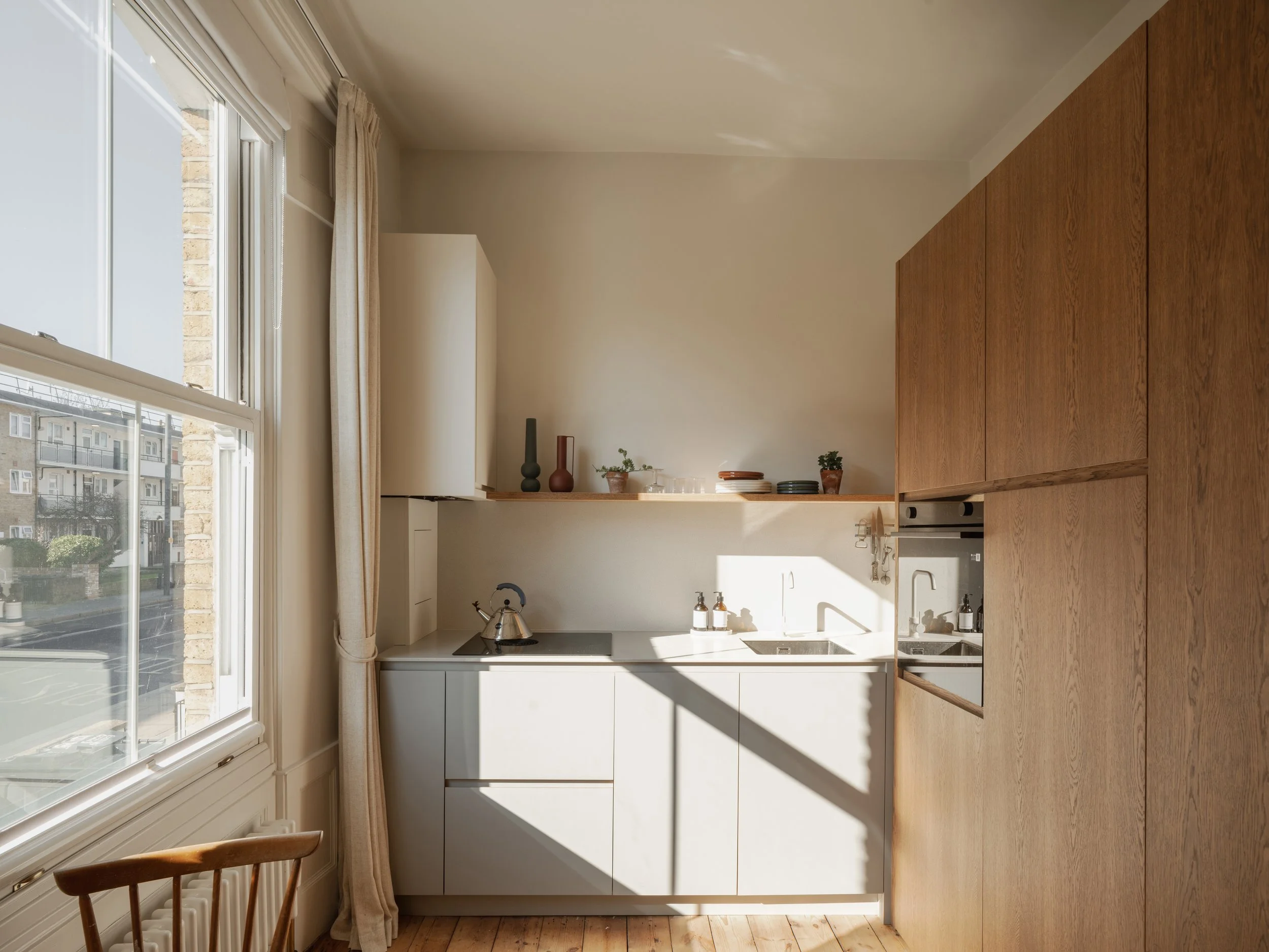 This two-bedroom apartment in Hackney has been reimagined with a focus on material warmth, seamless functionality, and understated elegance. The bespoke joinery—including a built-in bed, wardrobe, and shelving—maximizes space while maintaining a clean, refined aesthetic. The kitchen, now part of an open-plan living, dining, and home office area, is designed as a subtle yet highly functional backdrop to daily life.