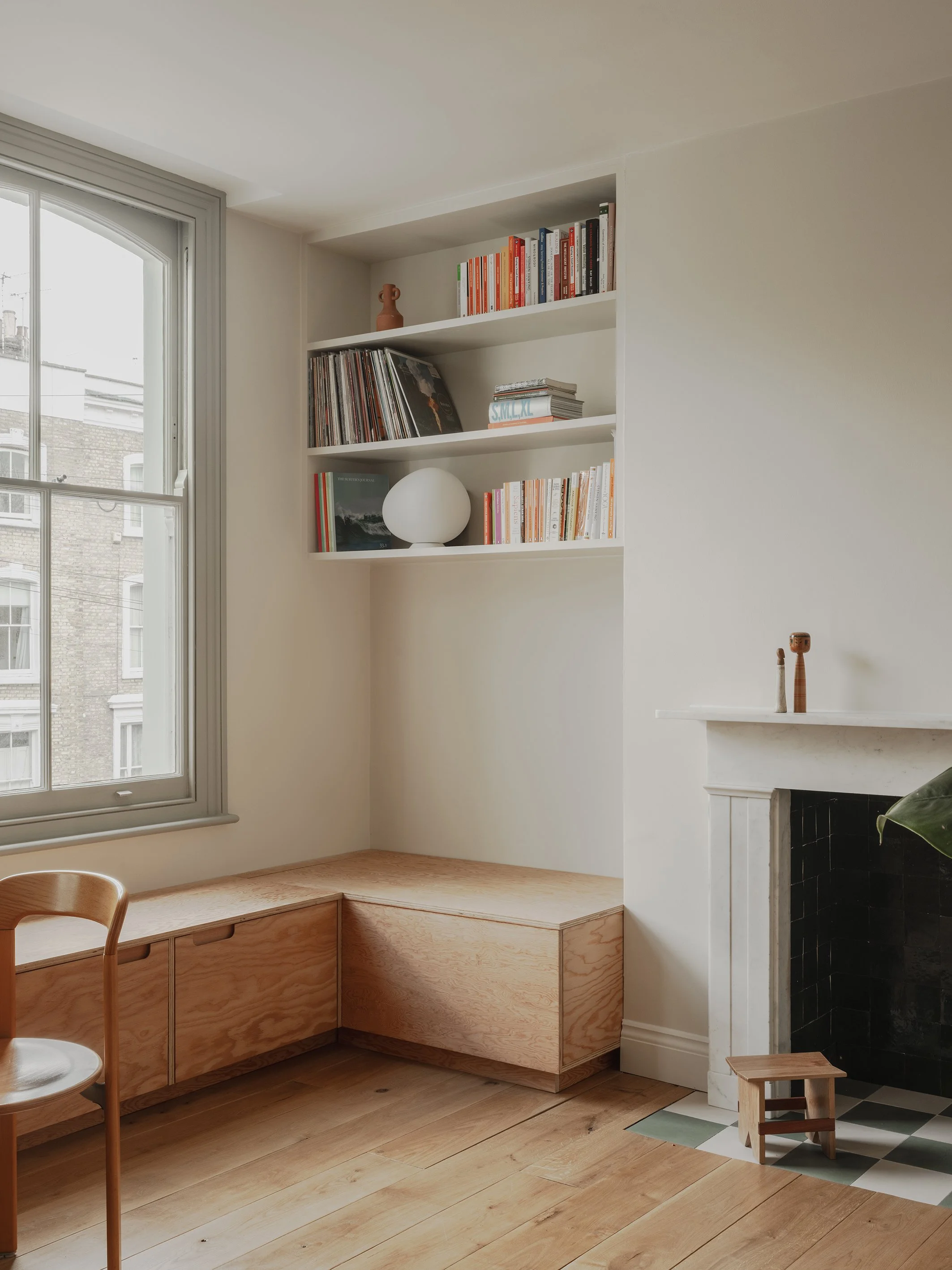 Additionally, we installed custom made alcove shelving to the living room, offering a simple yet modern solution to complement the recently renovated space. With a focus on a subdued, natural material palette, these shelves seamlessly blend into the room's aesthetic.